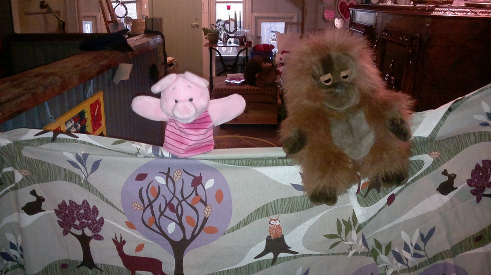 Mikäs sen mukavampaa kuin keksiä omia nukketeatteriesityksiä? Meille on kertynyt pino erilaisia käsinukkeja kirpputoreilta, kaupoista ja nettikaupoista. Niinpä päätin tehdä meille nukketeatterin yläkerran käytävään, lähelle lasten huoneita.
