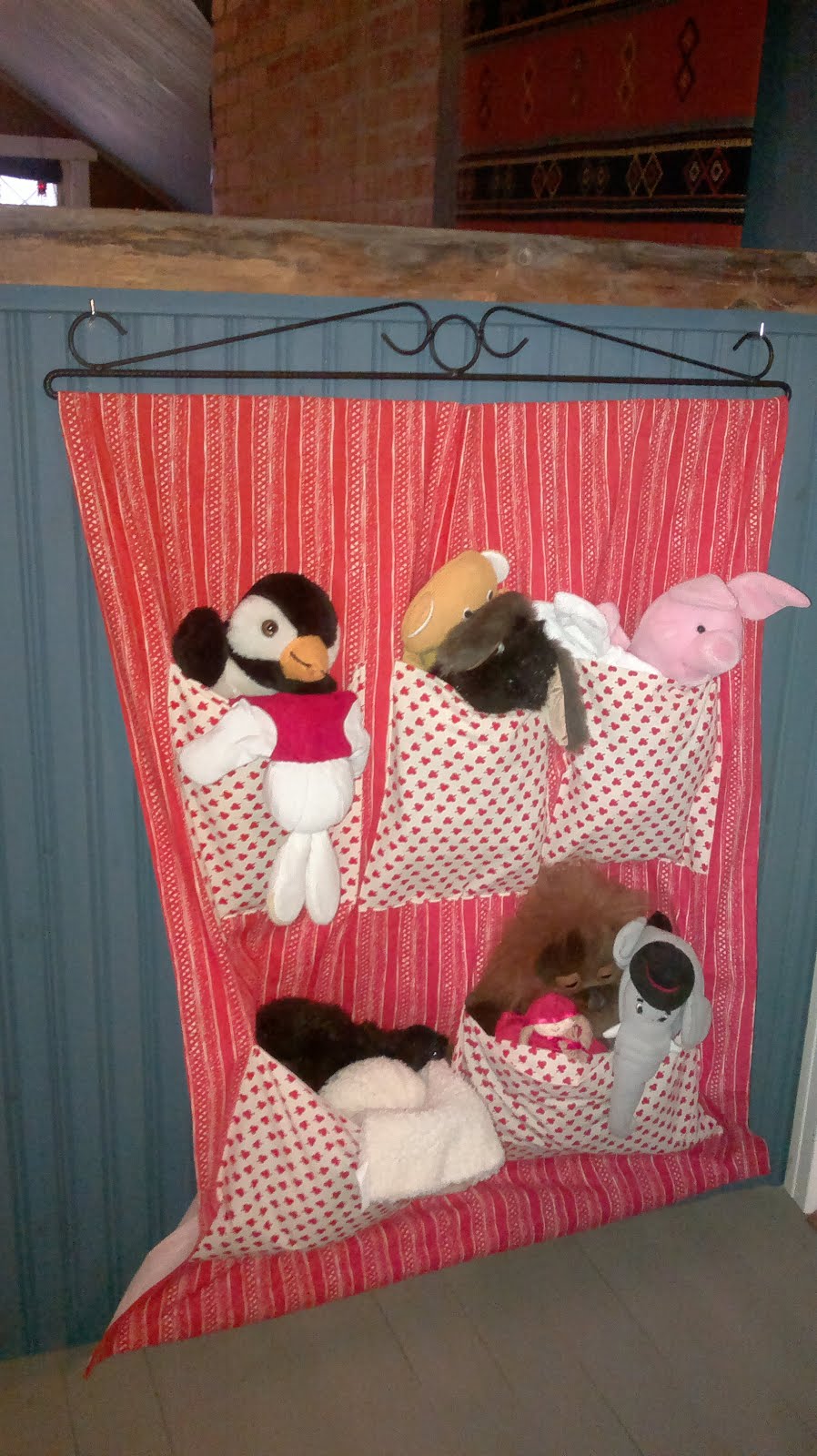 Käsinukeille kiinnitin portaikon takakaiteeseen, siis sinne aulan puolelle, vanhan kangaslokerikon – olen saanut sen joskus lapsena kirjakerhosta (joku saman omistanut ehkä tunnistaa!). Laitoin lokerikkoon metallisen kannatinraudan, jolloin kiinnitys on tukeva ja kaunis. Lokerikon isossa taskussa pidetään myös nukketeatterin kankaita silloin, kun teatteri ei ole käytössä.