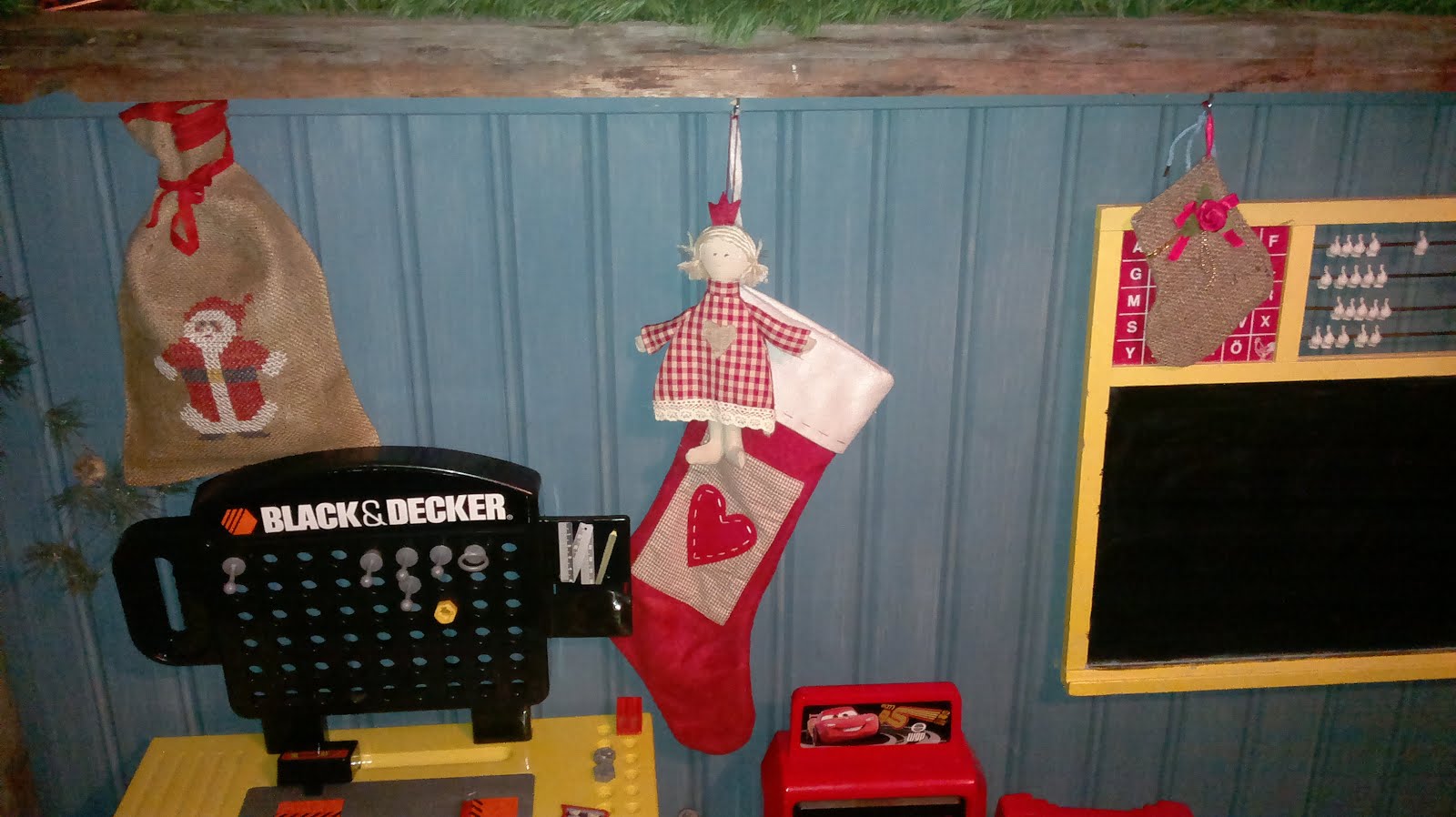 Erilaisilla joulusukilla ja joulukalentereilla saa sisustettua monenlaisia tiloja jouluiseksi. Meillä niillä koristellaan yläkerran aulaa, tarkemmin sanottuna portaikkoa ympäröivää kaidetta. Portaikko nousee piippua vasten ja kolmella muulla sivulla on kaiteet ja portti.