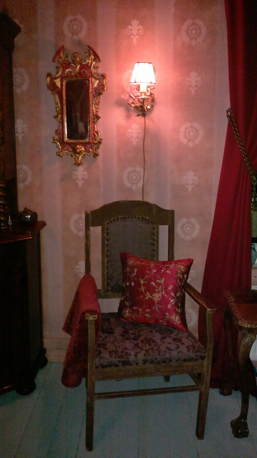 Olin haaveillut jo pidemmän aikaa oman tapetin maalaamisesta, joten suunnittelin kuvion ja tein sabluunat piirtoheitinmuovikalvoihin. Kuvioiden lisäksi päädyin pystyraitoihin.