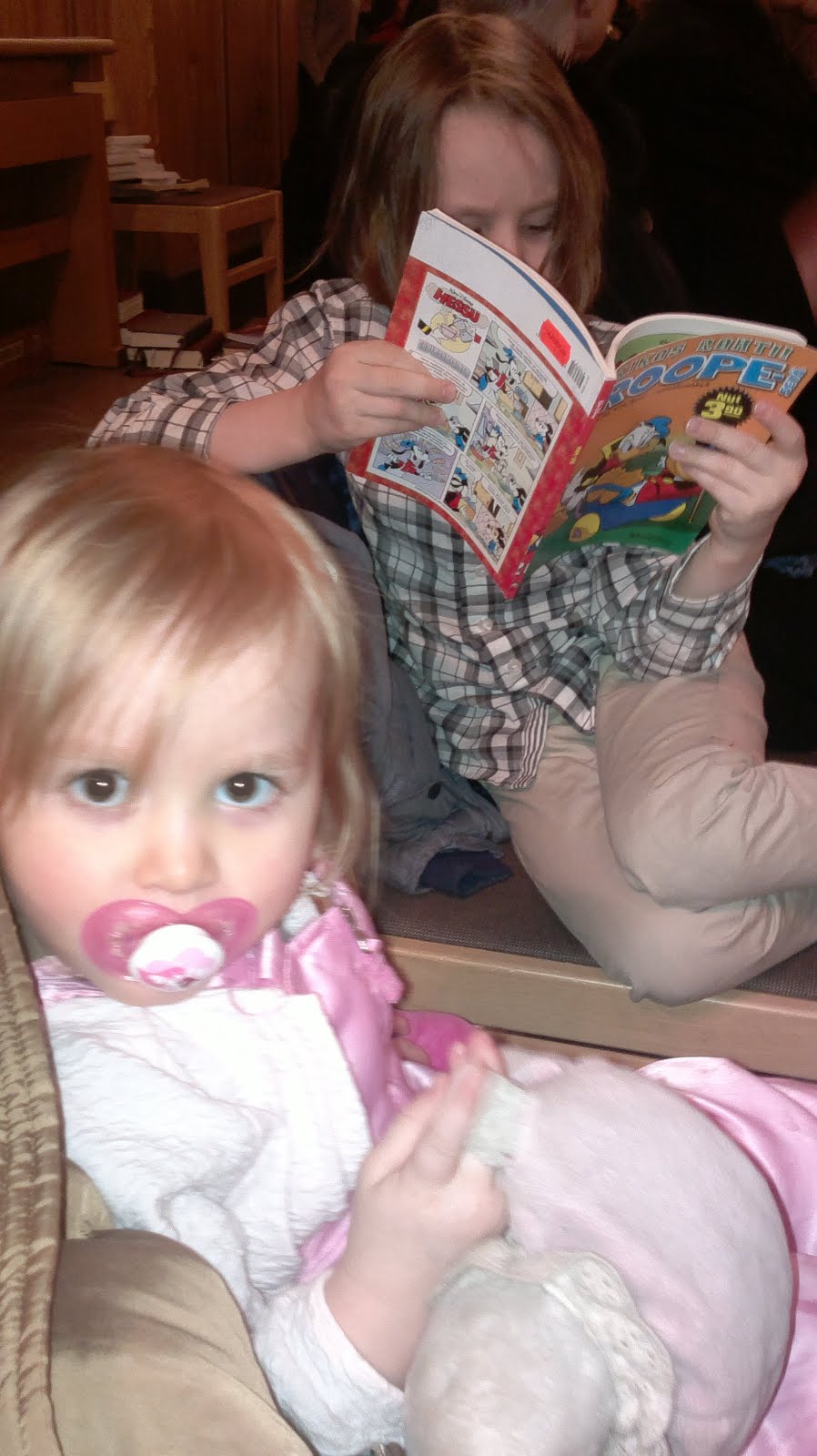 Kirkkoon varasimme molemmille lapsille lukemista – vanhemmalle Aku Ankka- ja nuoremmalle Nalle Puh -lehtiä. Lisäksi ostimme mukaan myslipatukoita, tikkarit ja lakritsipatukat. Roosa-Ilonalla oli tietenkin rakas Pupu mukana ja pääsipä mukaan toinenkin pupukaveri.