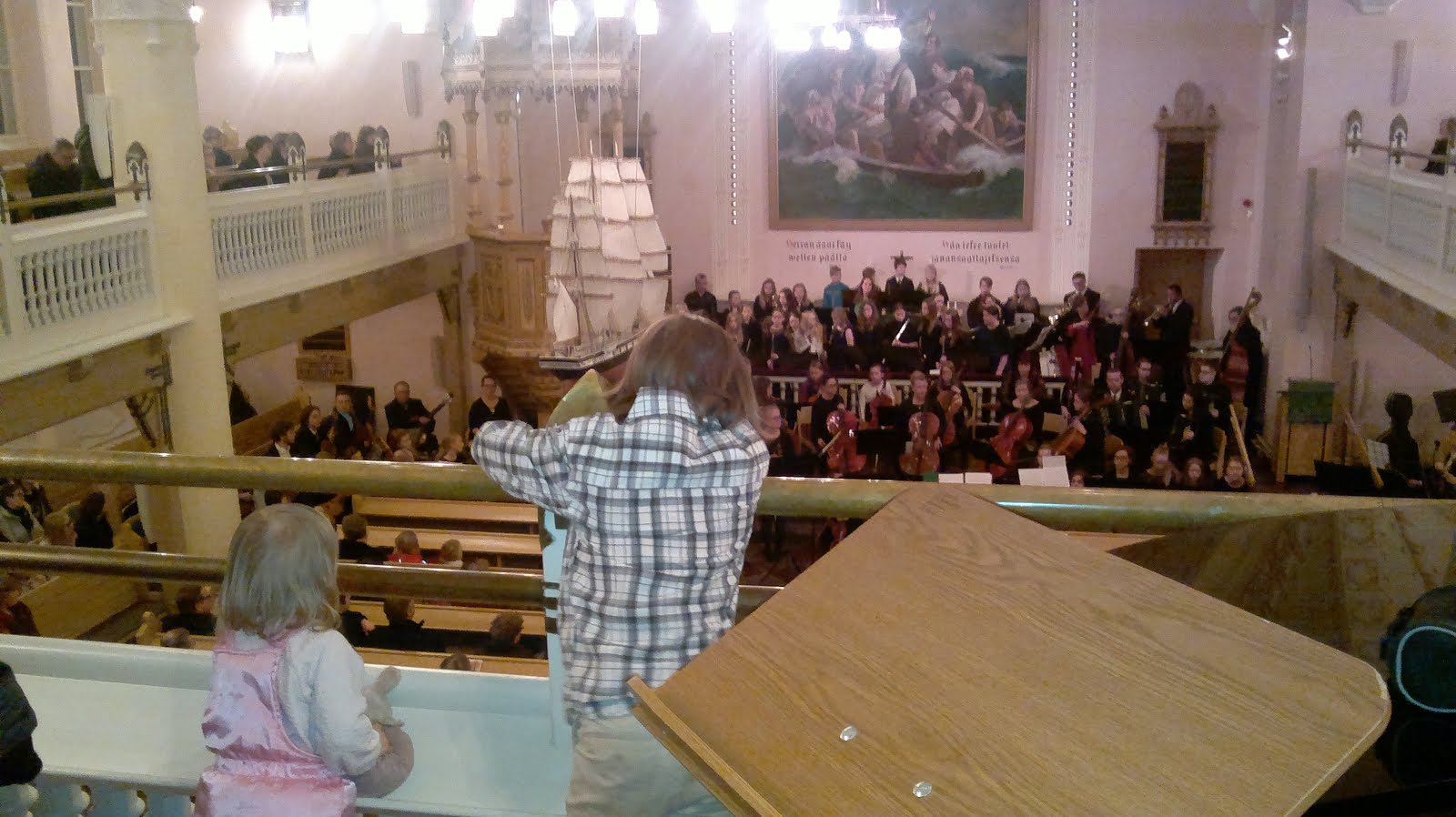 Onneksi Roosa hoksasi heti, että hän haluaa mennä ylös – se osoittautui parhaaksi paikaksi seurata konserttia. Tuolirivin ja parvin laidan väliin jäi reilusti tilaa, missä Roosa sai kuljeskella ja tanssahdella. Laita näytti olevan lapsille myös suosittu nojailupaikka – siinä seisoskeli välillä enemmänkin lapsia katselemassa orkesteria.