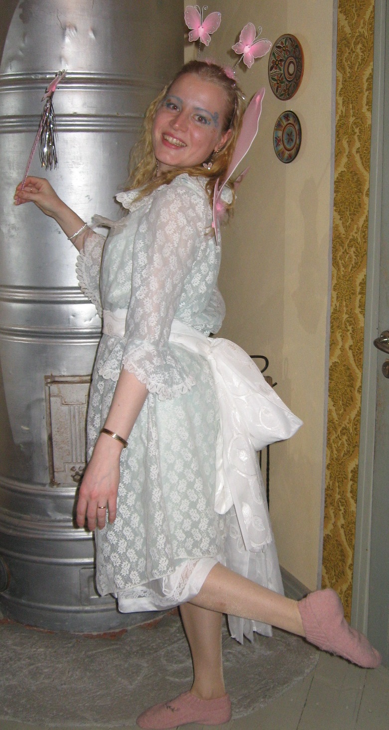 Täytyyhän tähän yksi asu myös minulta laittaa 😀 Tässä olen pukeutuneena keijukaiseksi. Alla on pitsiunelma-yöpuku (joka ei tässä kuvassa näy), jonka päällä on pitsiunelma-aamutakki! Vyönä on pitkä voilee-kankaan palanen.