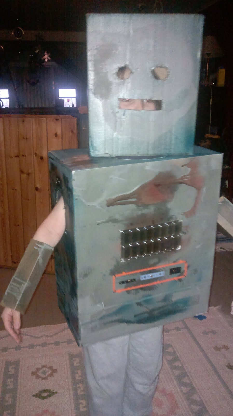 Eemil-Eepille teimme HopeeNopee-robotin puvun pahvilaatikoista. Ohjeet löytyvät blogista. Säilytyksessä robotin laatikot ovat sisäkkäin ja laatikkoon mahtuu vielä kätevästi muitakin naamiaisasusteita, esimerkiksi kypäriä. Kätevä säilytysteline siis 👌