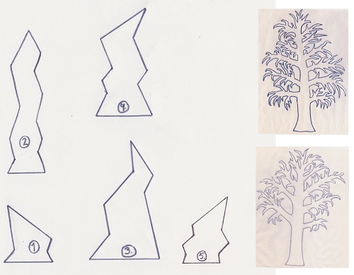 Piirrä puut (2 kpl) mustaan paperiin, leikkaa ja liimaa portin molemmin puolin. Puiden oksat voivat tulla osittain ikkunoiden ja kummitusten päälle.